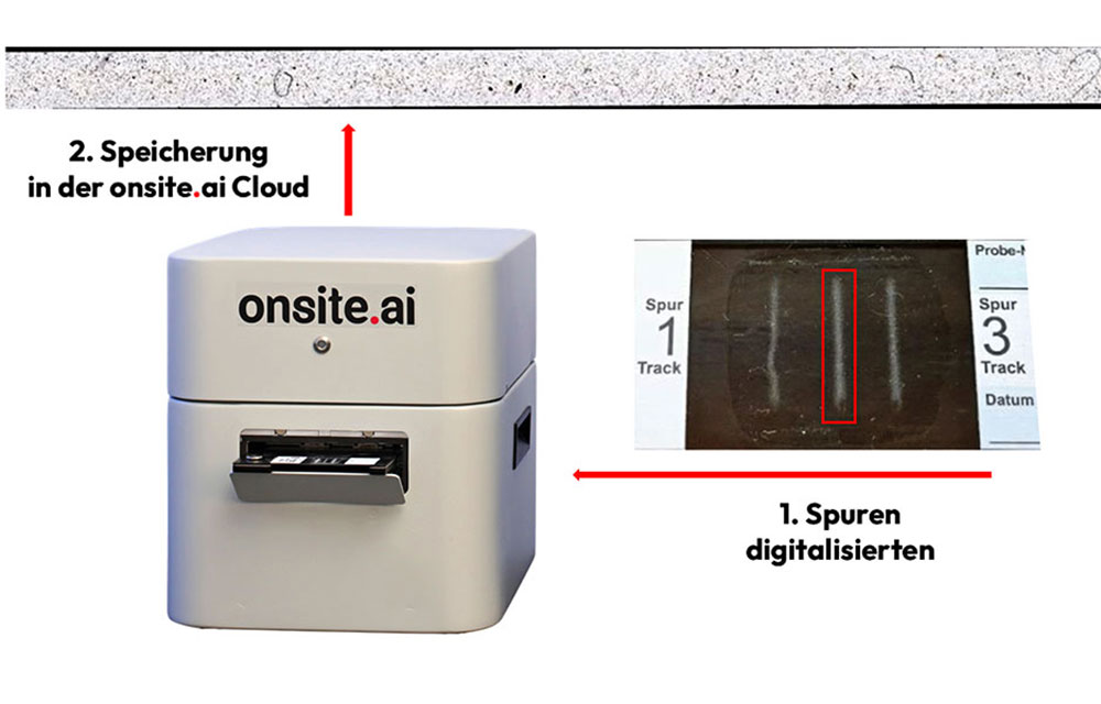 Die gesamte Partikelspur wird vollautomatisch und hochauflösend gescannt. Sie wird als digitaler Schatten dauerhaft gespeichert und mit der onsite.ai Cloud synchronisiert. Die Daten sind standardisiert, reproduzierbar und jederzeit für Auswertung, Archivierung und Nachanalysen verfügbar. Direkt auf der Baustelle, bei Ihnen im Büro oder bei onsite.ai im Labor.